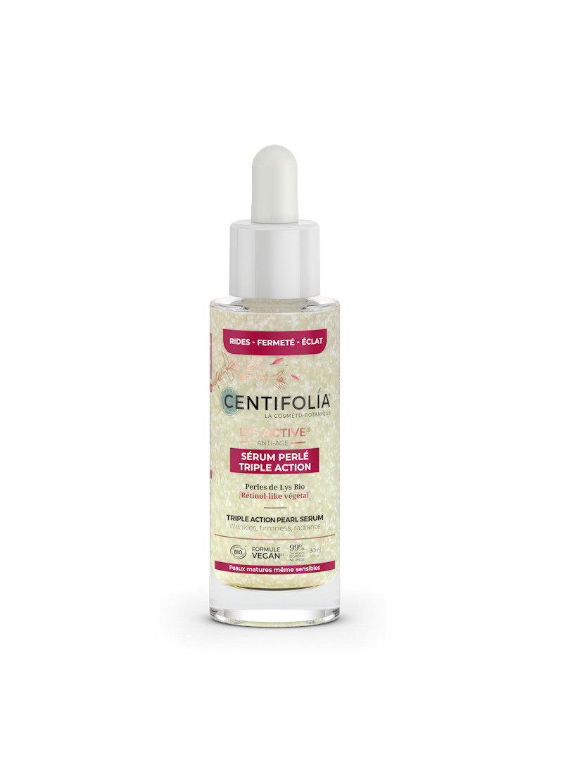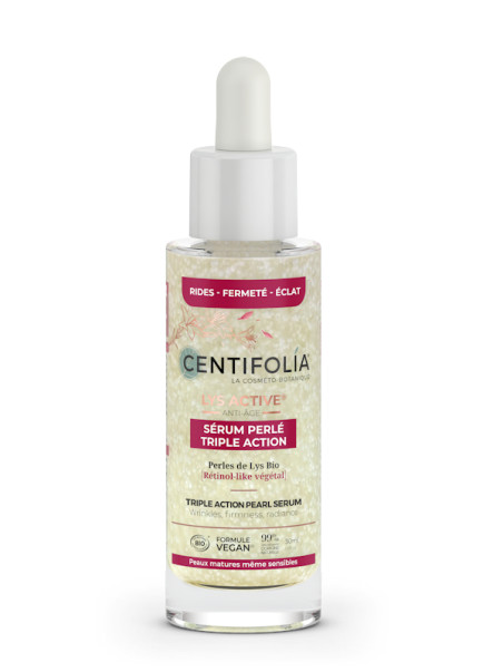 Avec l’âge, la peau perd de sa fermeté, les rides s’installent et le teint devient moins uniforme. Pour répondre à ces besoins spécifiques, Centifolia a développé le Sérum Perlé Triple Action Lys Active®, un soin intensif hautement concentré, agissant sur les rides, la fermeté du visage et son éclat - spécialement formulé pour les peaux matures, même sensibles.